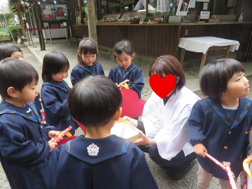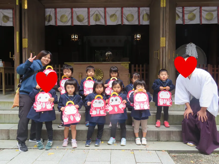 11月15日は七五三という事で各クラスで七五三袋を作り、もも組が一足お先に神社へお参りに行ってきました!